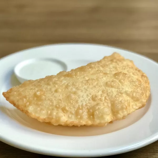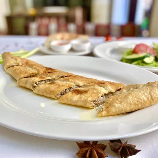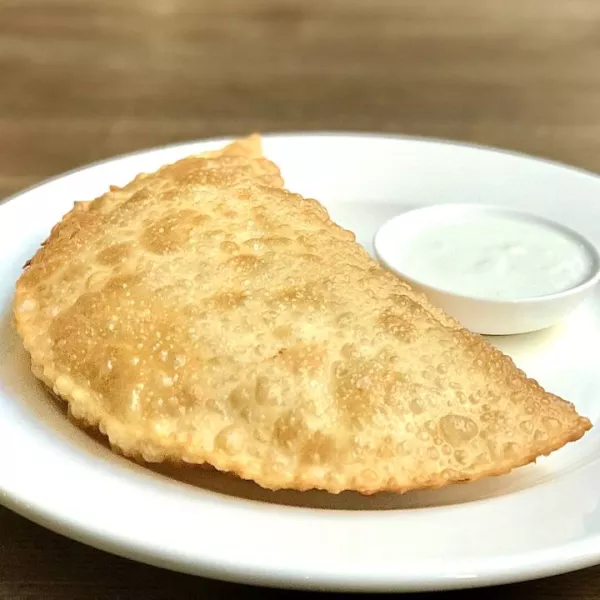 Чебурек з яловичим фаршем та цибулею, засмажений в олії. Три і більше чебуреків подаються як комбо, з салатом і соусами.
