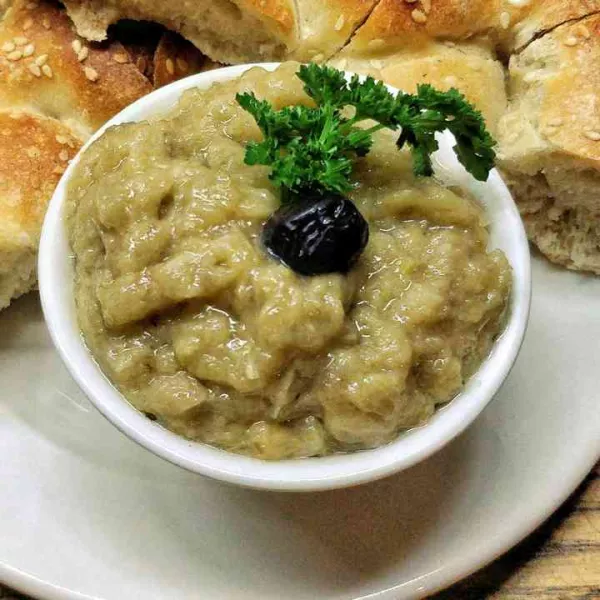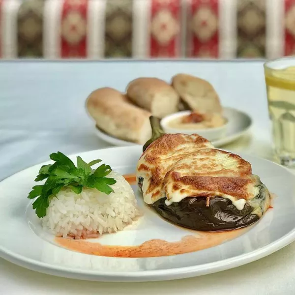 Цільний баклажан, начинений м'ясною начинкою та сиром, і запечений. Подається на подушці з аджики з рисом.
