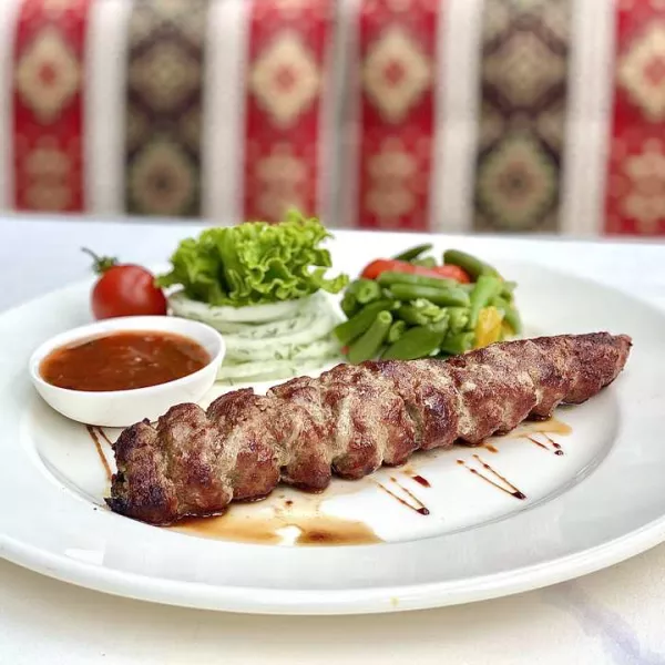 Традиційний кебаб з дрібно рубаного фаршу яловичини з додаванням гострої аджики, цибулею та спеціями. Подається з маринованою цибулею та соусом. Включає гарнір - рис, булгур або спаржеву квасолю.