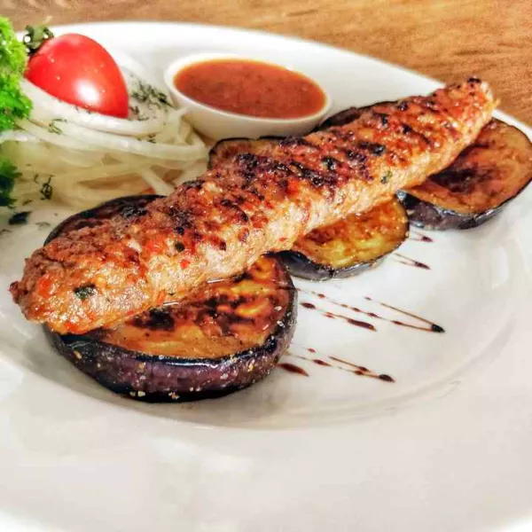 Традиційний кебаб з дрібно рубаного фаршу баранини з цибулею і спеціями, а також баклажанами на мангалі. Подається з маринованою цибулею та соусом.