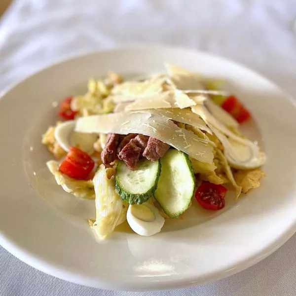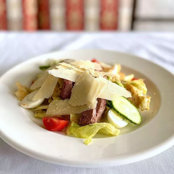 Салат айзберг, твердий сир, яловичина на грилі, томати чері, перепелині яйця, гірчичний соус.