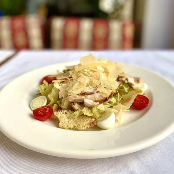 Салат айзберг, твердий сир, курка на грилі, томат чері, перепелині яйця, гірчичний соус.