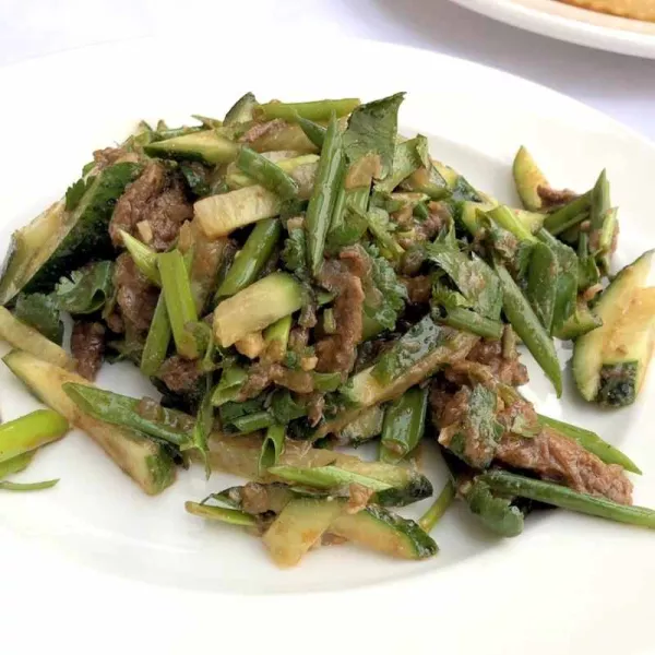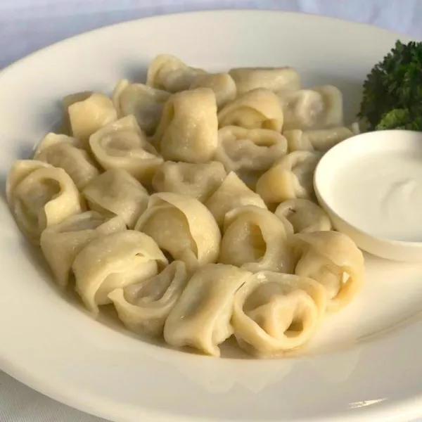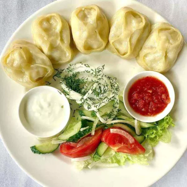 Дрібно посічене мʼясо з цибулею в тонко розкатаному тісті, готуються на пару. Пʼять і більше манти подаються як комбо, з салатом і соусами.