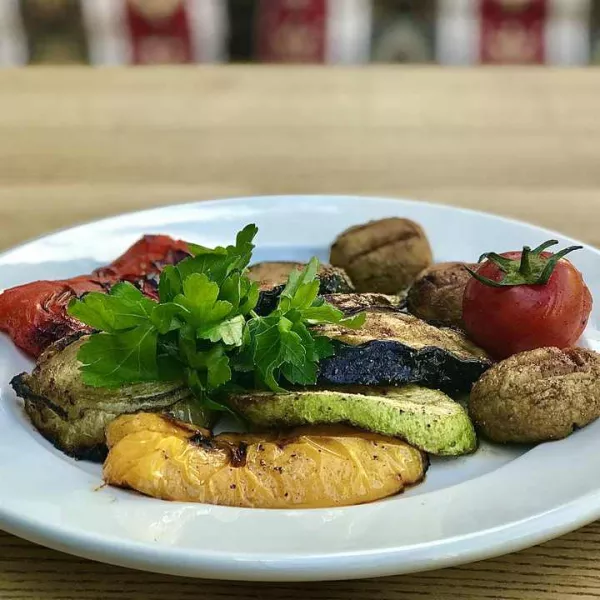 Перець, томат, гриби, баклажани, кабачки, кукурудза, цибуля з сіллю та спеціями на грилі.