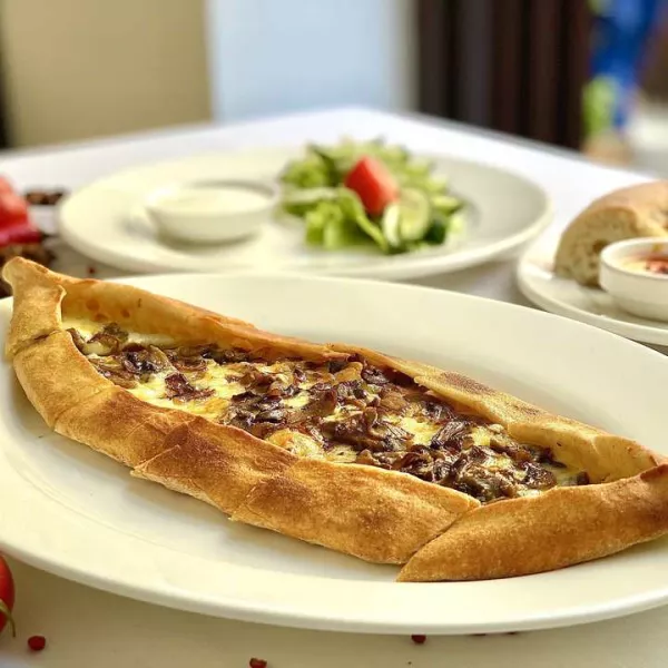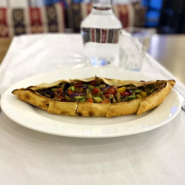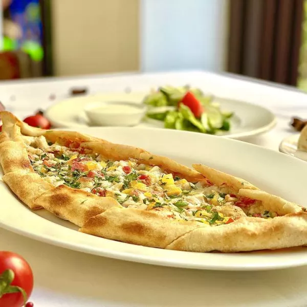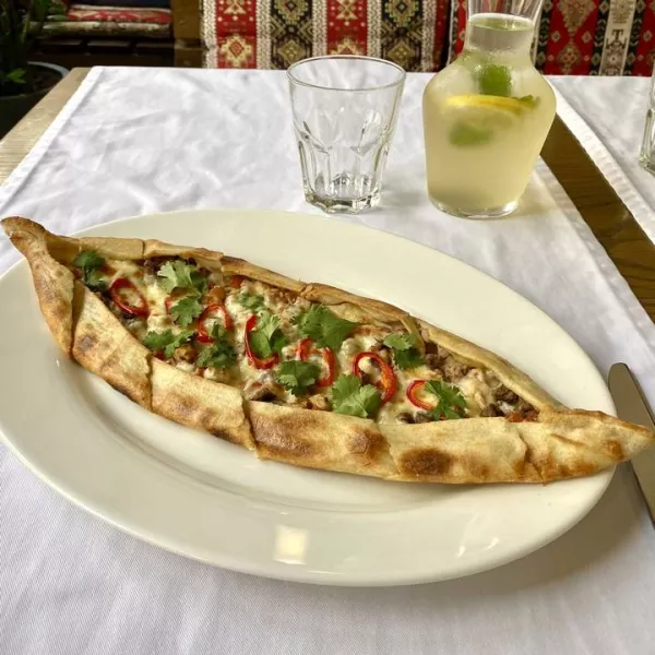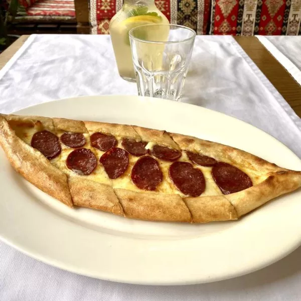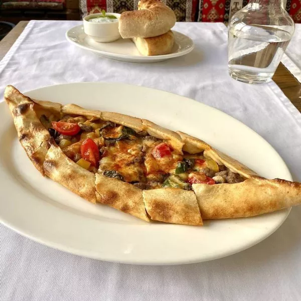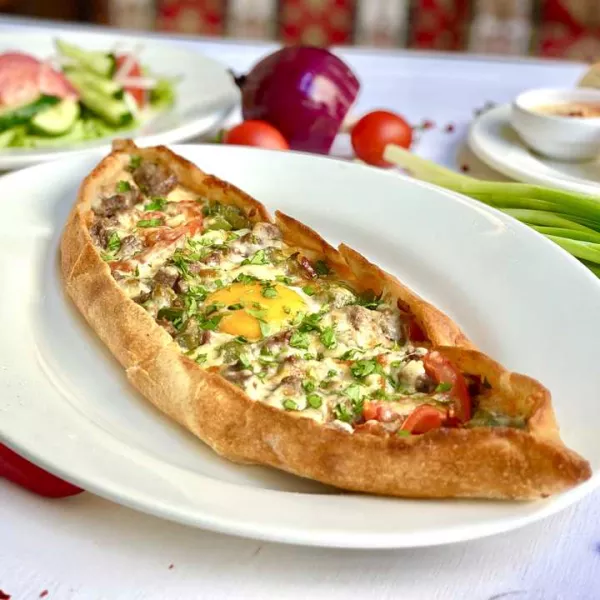 Піде з рубленою бараниною, солодким перцем, печерицями, черрі, пікантним сулугуні, цибулею, та ароматним базиліком.