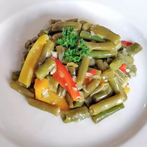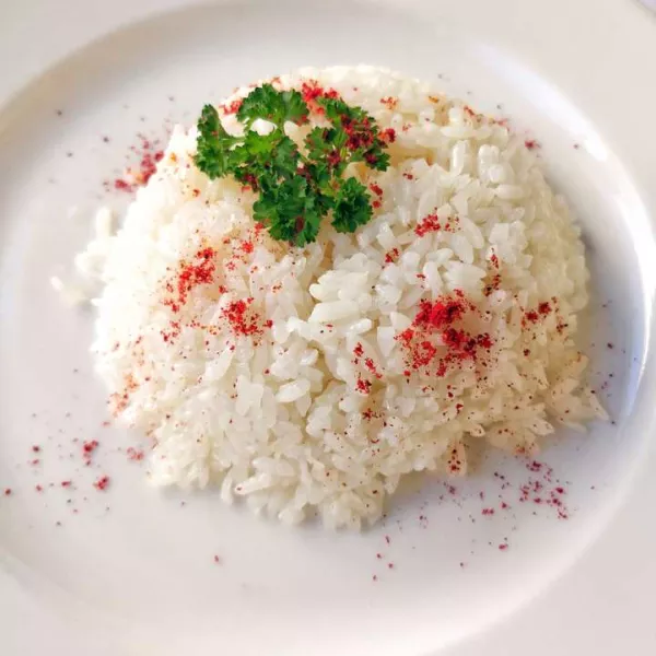 Яловича вирізка зі спеціями, оливковою олією, маринованою цибулею та гарніром - рисом, булгуром або спаржевою квасолею.