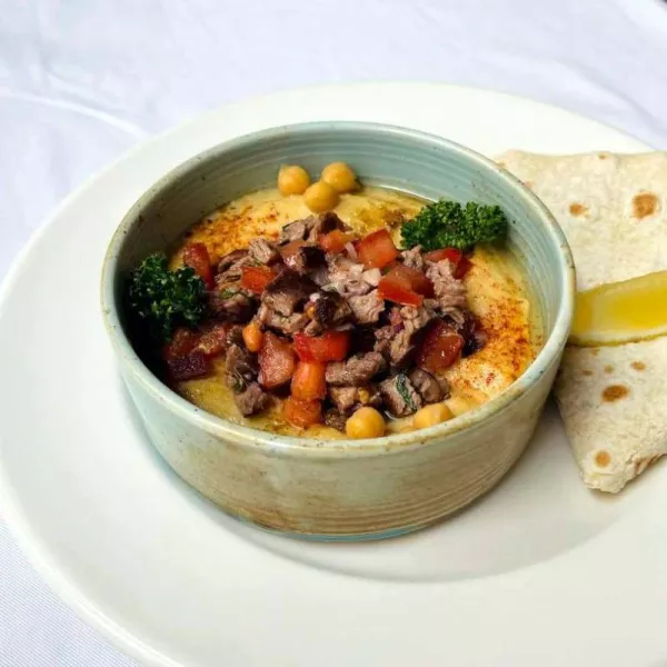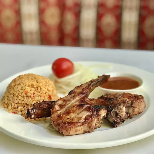 Баранина зі спеціями, оливковою олією, маринованою цибулею та гарніром - рисом, булгуром або спаржевою квасолею.