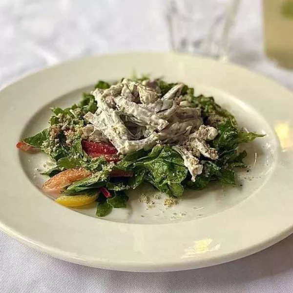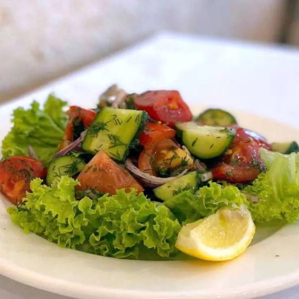 Рукола, шпинат, болгарський перець в горіхово - медовому соусі та телячий язик в соусі тартар. Подається зі шматочком лимону.