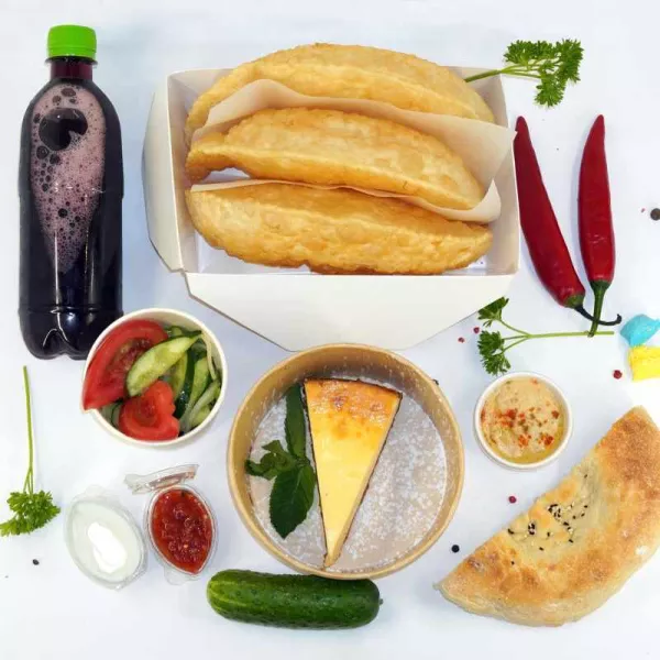 Чебурек з яловичим фаршем, цибулею, грибами, сиром та спеціями, засмажений в олії. Три і більше чебуреків подаються як комбо, з салатом і соусами.
