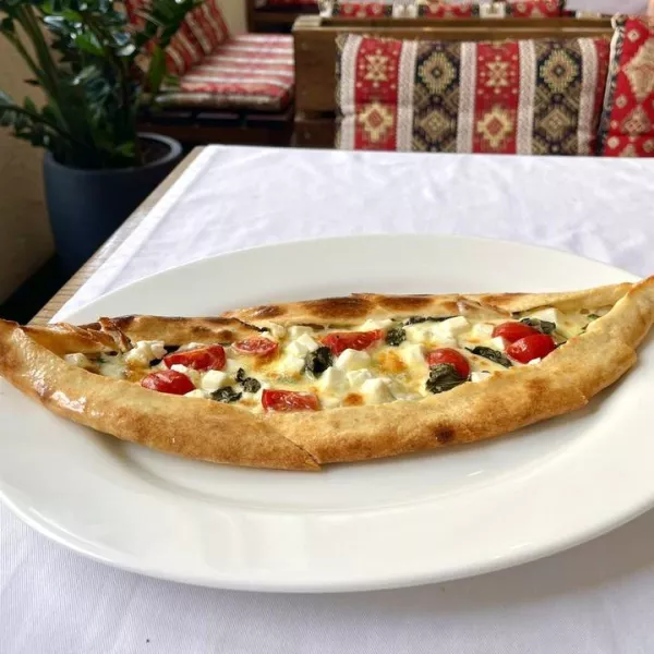 Піде з сиром сулугуні, шматочками фети, черрі, свіжими шпинатом та ароматним базиліком.