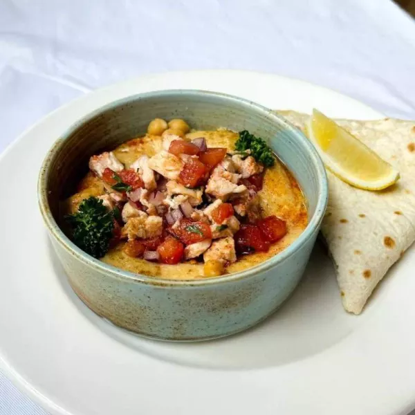 Традиційний корж з тіста з рубленим курячим м'ясом і овочами, запечений в дров'яній печі. Екстра додатки безкоштовно.