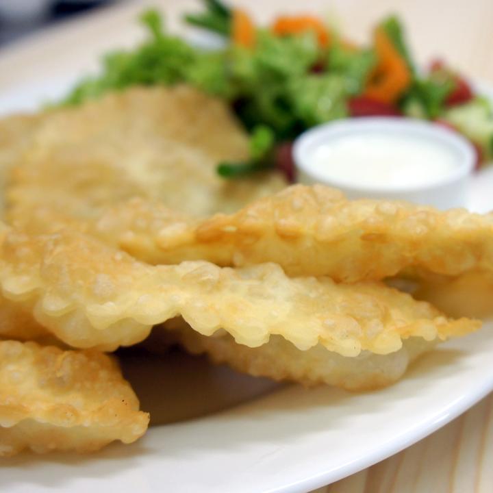 Чебурек з яловичим фаршем, цибулею та сиром. Три і більше чебуреків подаються як комбо, з салатом і соусами.
