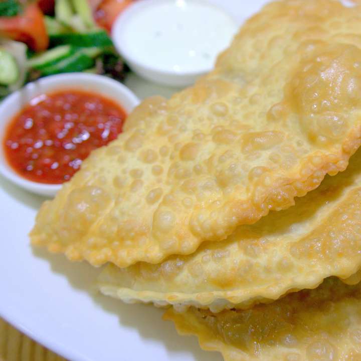 Чебурек з сиром. Якщо ви замовили 3 і більше чебуреків, то вони подаються як комбо, з салатом і соусами.