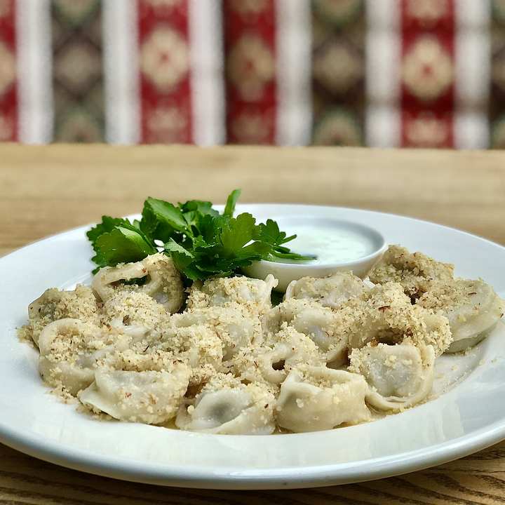 Кримськотатарські пельмені з яловичиною, посипані меленим горіхом.