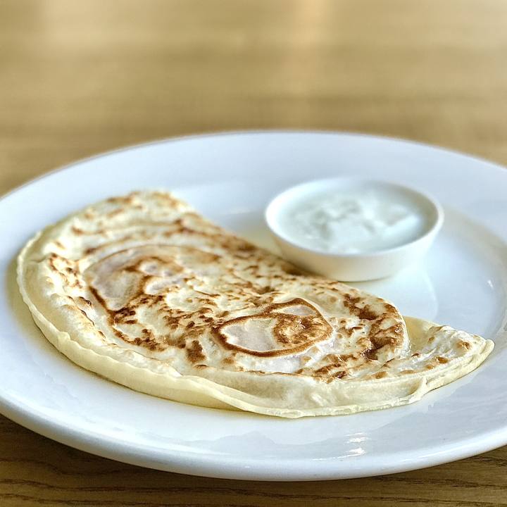 Янтик з бринзою. Готується на розпеченій сухій сковороді без масла. Після приготування змащений вершковим маслом. Три і більше янтиків подаються з салатом і соусами.