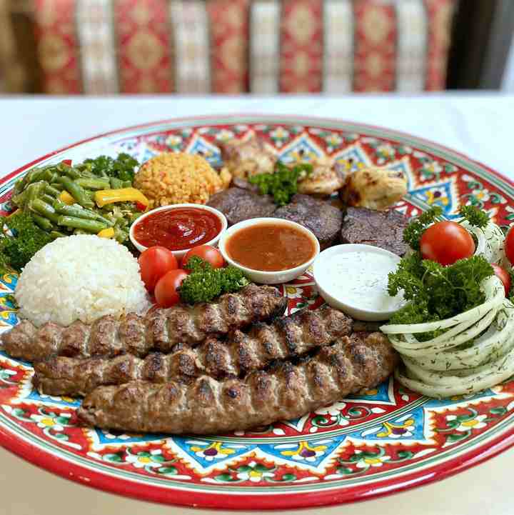 Великий кебаб з комбінації шашлику з яловичої вирізки, люля кебаба з баранини і шашлику з курки. Подається з гарніром, маринованою цибулею і соусами.