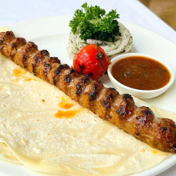 Традиційний кебаб з дрібно рубаного фаршу яловичини з додаванням гострої аджики, цибулею та спеціями. Подається з маринованою цибулею та соусом. Включає гарнір - рис, булгур або спаржеву квасолю.