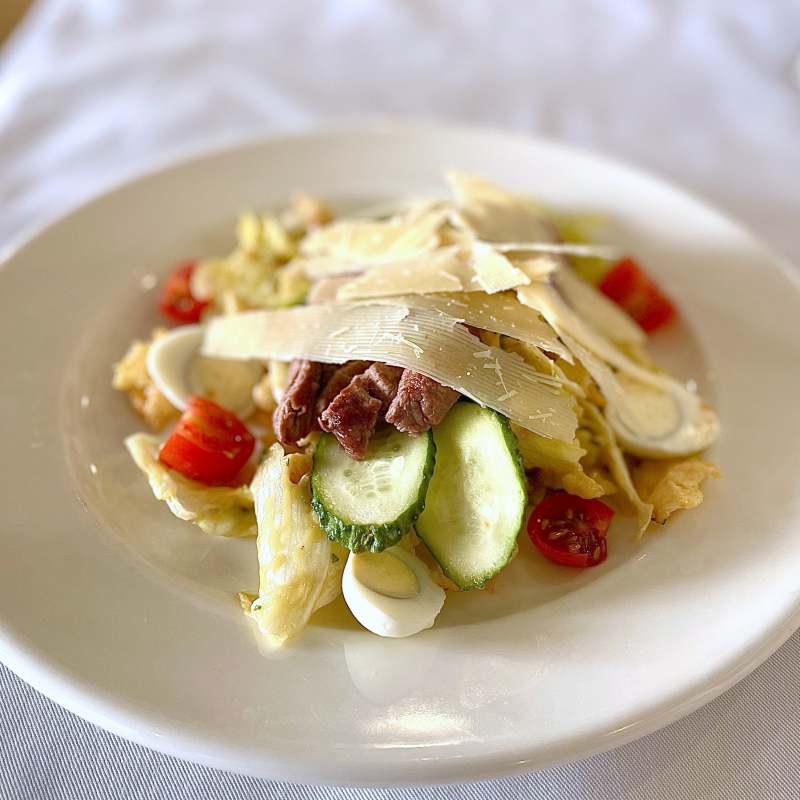 Салат айзберг, твердий сир, яловичина на грилі, томати чері, перепелині яйця, гірчичний соус.