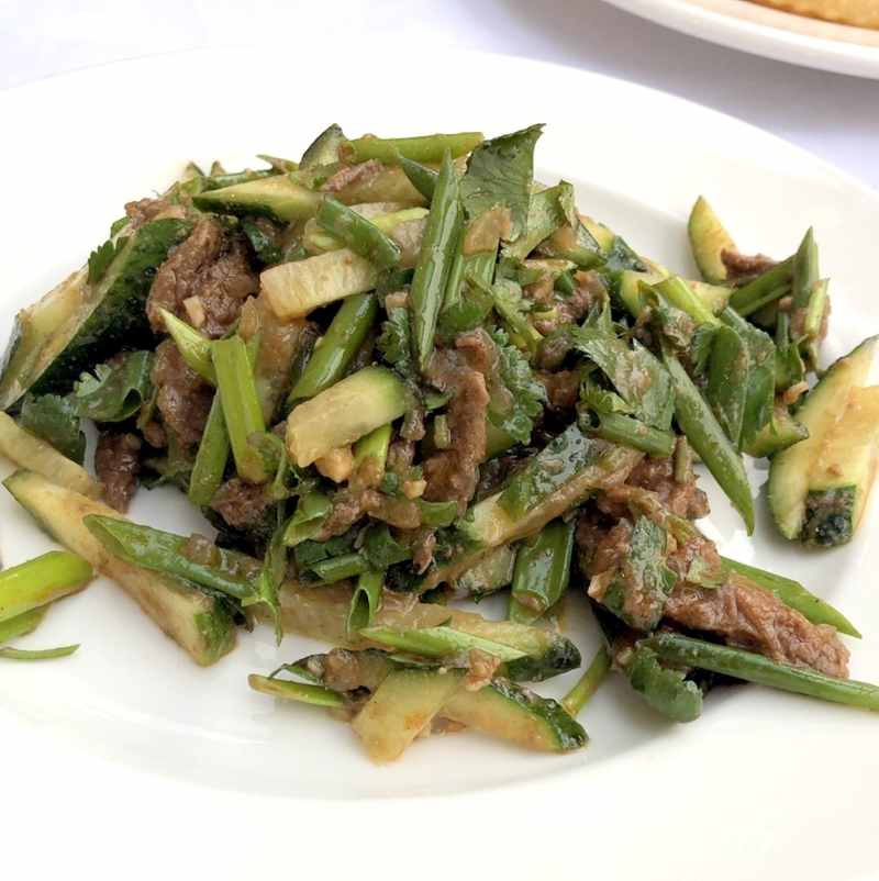 Салат з телятиною в томатному соусі, огірками, кінзою та зеленою цибулею.
