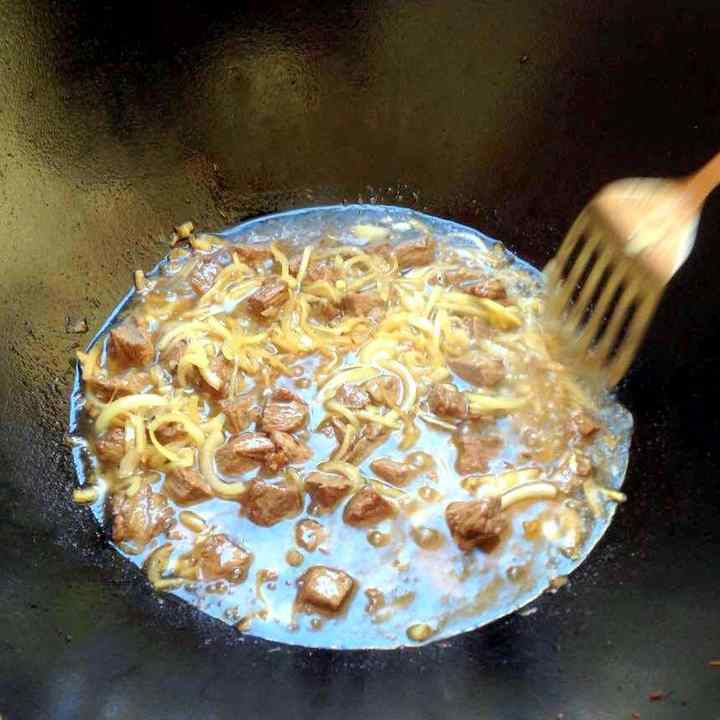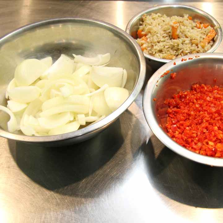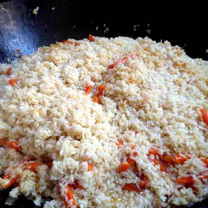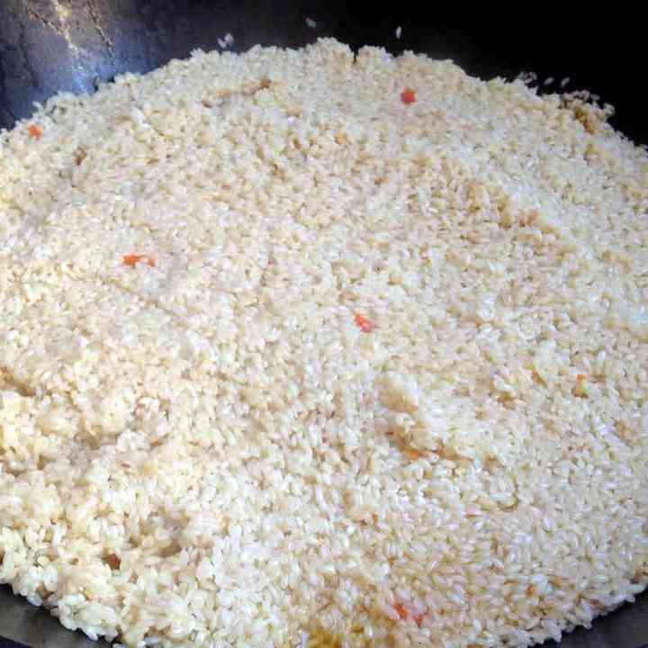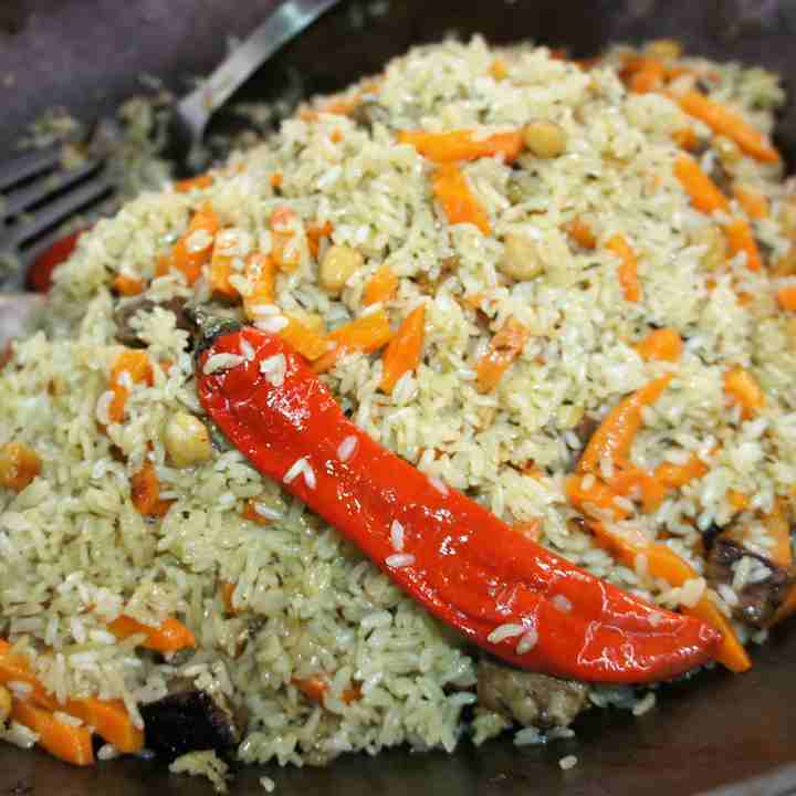 Класичний узбецький плов (рис, яловичина, нут, цибуля, морква, спеції). Подається з салатом з помідорів та цибулі і коржиком.