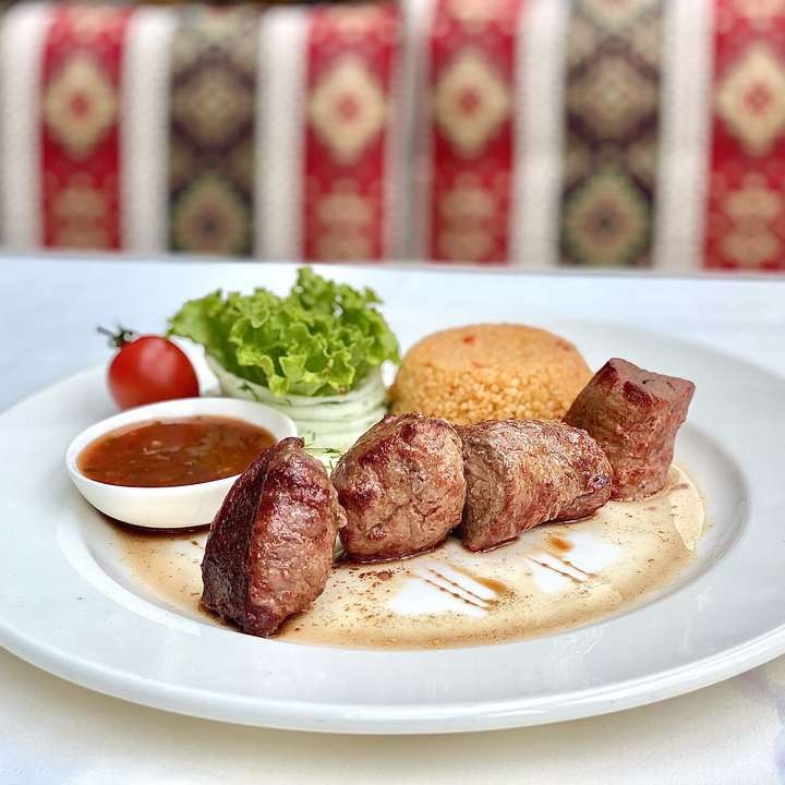 Яловича вирізка зі спеціями, оливковою олією, маринованою цибулею та гарніром - рисом, булгуром або спаржевою квасолею.