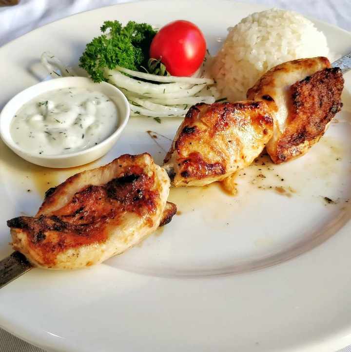 Мариновані курячі стегенця без кісточки і філе. Подається з маринованою цибулею, соусом та гарніром - рисом, булгуром або спаржевою квасолею.